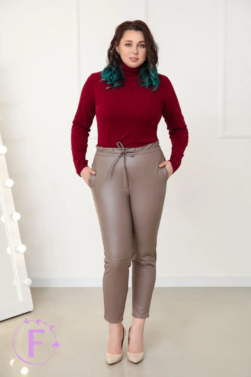 Теплі штани з екошкіри на хутрі від нашого бренда заслуговують на особливу увагу. Модель виготовлена зі штучної шкіри високої якості. З вивороту матеріал утеплений кавотеленим густим хутром, що дає змогу йому добре зберігати тепло та бути приємним до тіла. Вироби з цієї тканини не вимагають складного догляду: досить сполоснути в теплій мильній воді (не рекомендується прати в машинці та за високих температур).