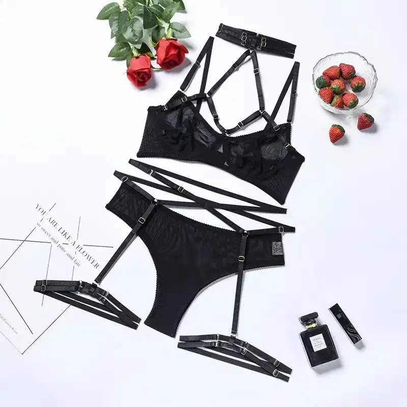Комплект жіночої білизни у чорному кольорі трусики, бюстгальтер, пояс з підтяжками